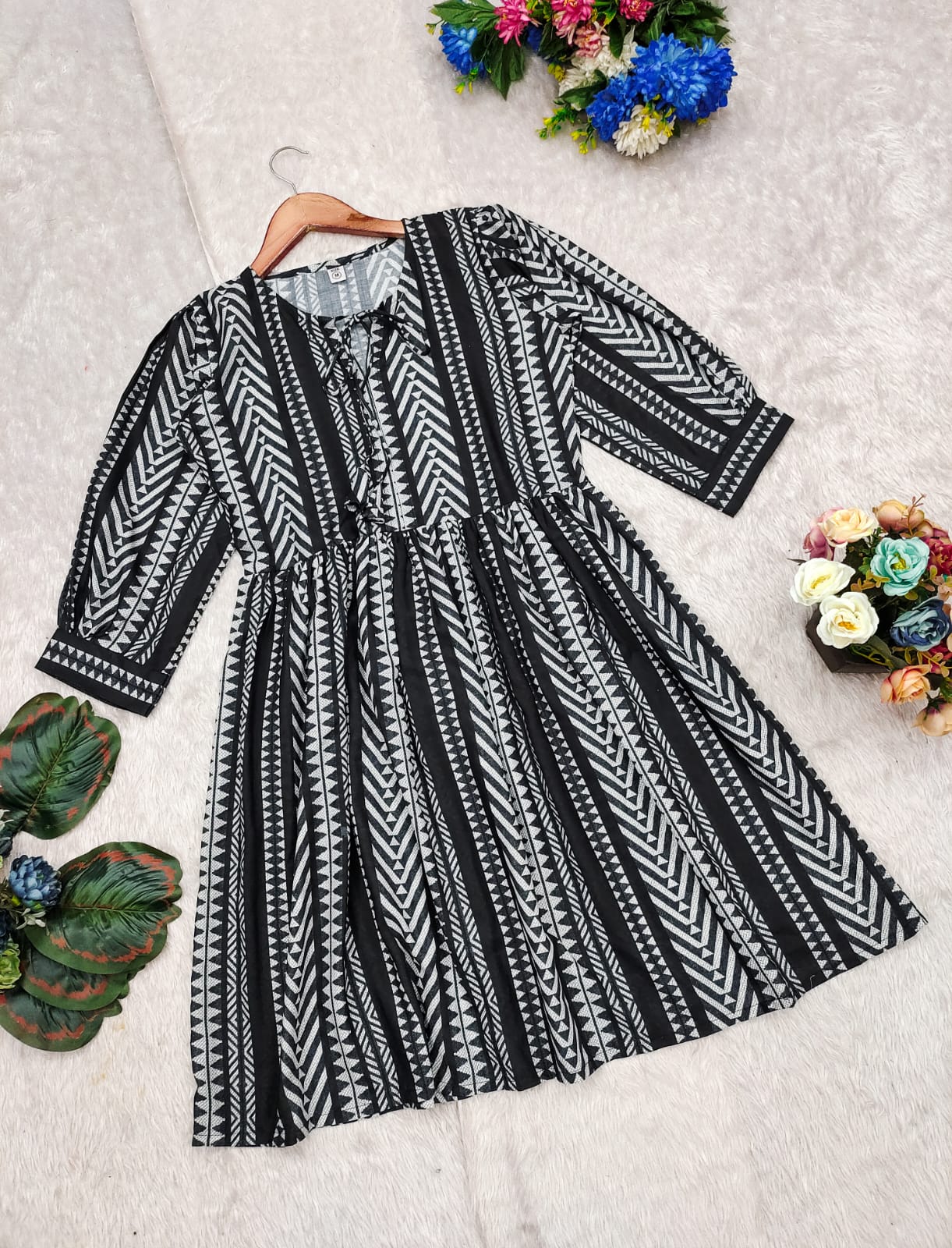 Black Casual Cotton One-Piece Tunic with Timeless Prints